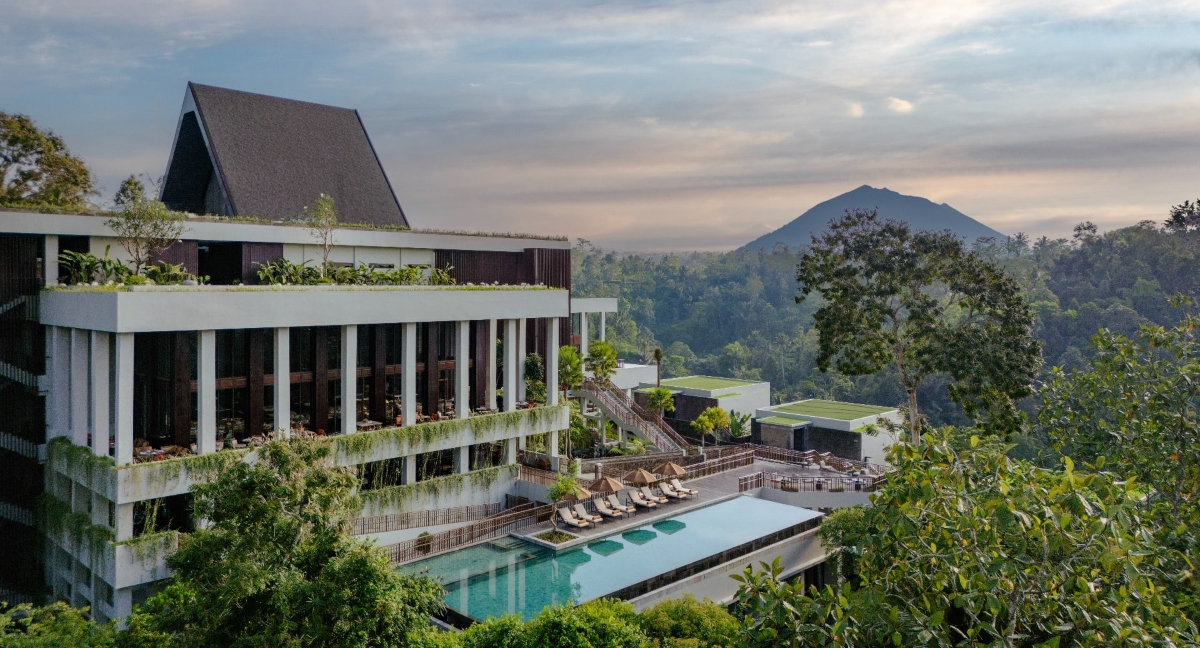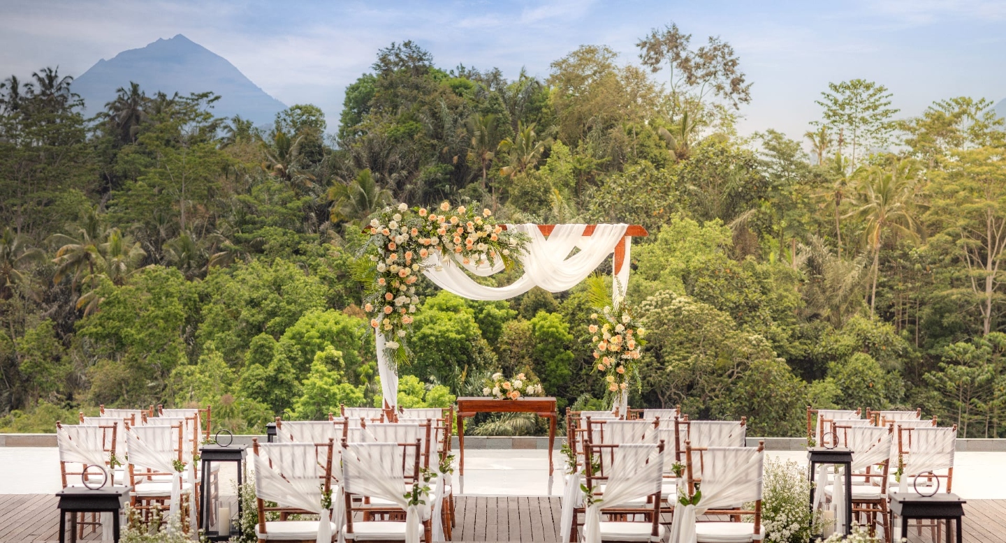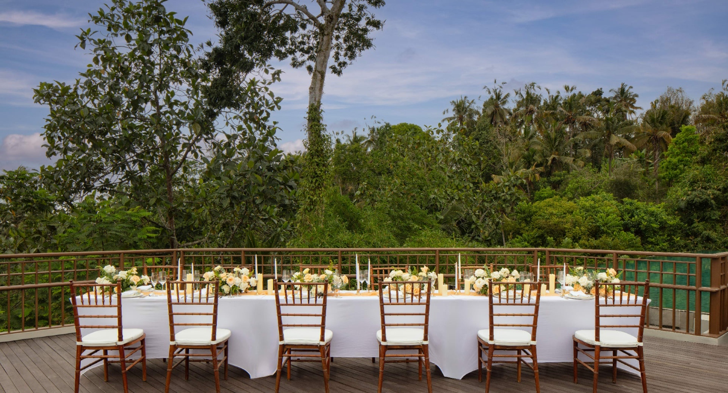 - Lobby Deck & Garden (Outdoor): The absolute main character of wedding spots. This natural stage offers an unobstructed, panoramic view of the lush rainforest and Mount Agung. It is the ultimate golden-hour spot for exchanging vows, followed by champagne and canapés under the stars.