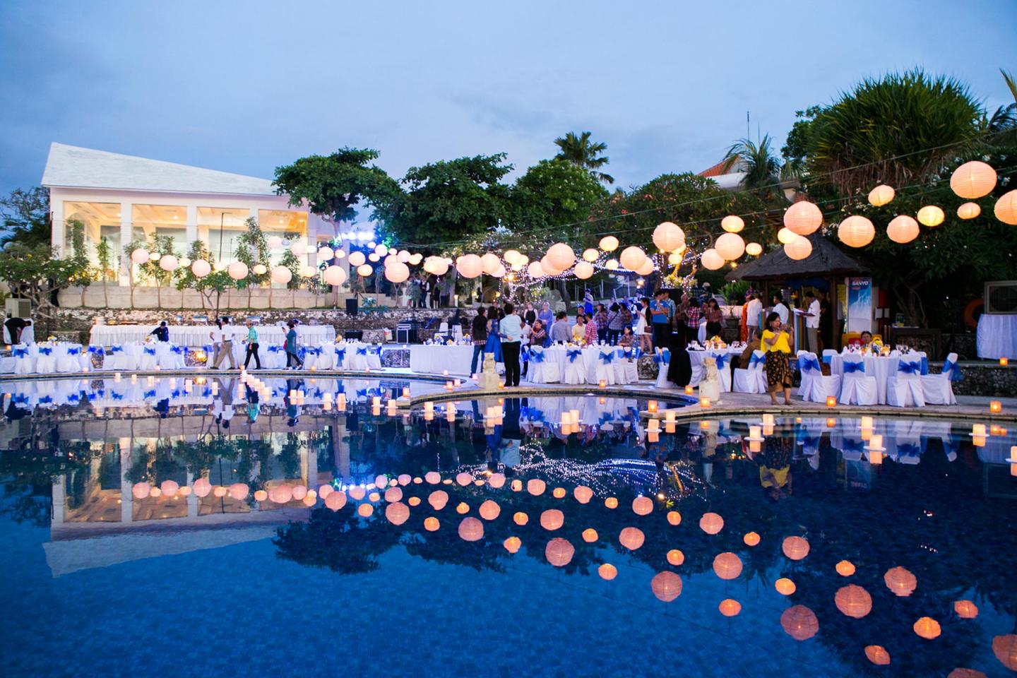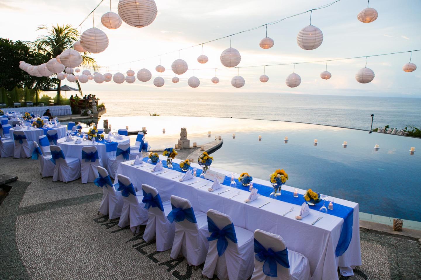 Imagine private villa living with a backdrop exposed to the element of the ocean. Intimate dining moments against the orange tinged Balinese Sunset, or simply taking time out to marvel at the evening sky studded with a thousand dancing stars.Blue Point also reserves your wedding pavillion which most of wedding couple called it Blue point chapel.An Air-conditioned chaple which can accomodate upto 40 guest during ceremony.Next to the chapel is a beautiful swimming pool and it looks merge with the Indian ocean.Your dinner reception can be set up by the infinity pool ,it is amazing view .