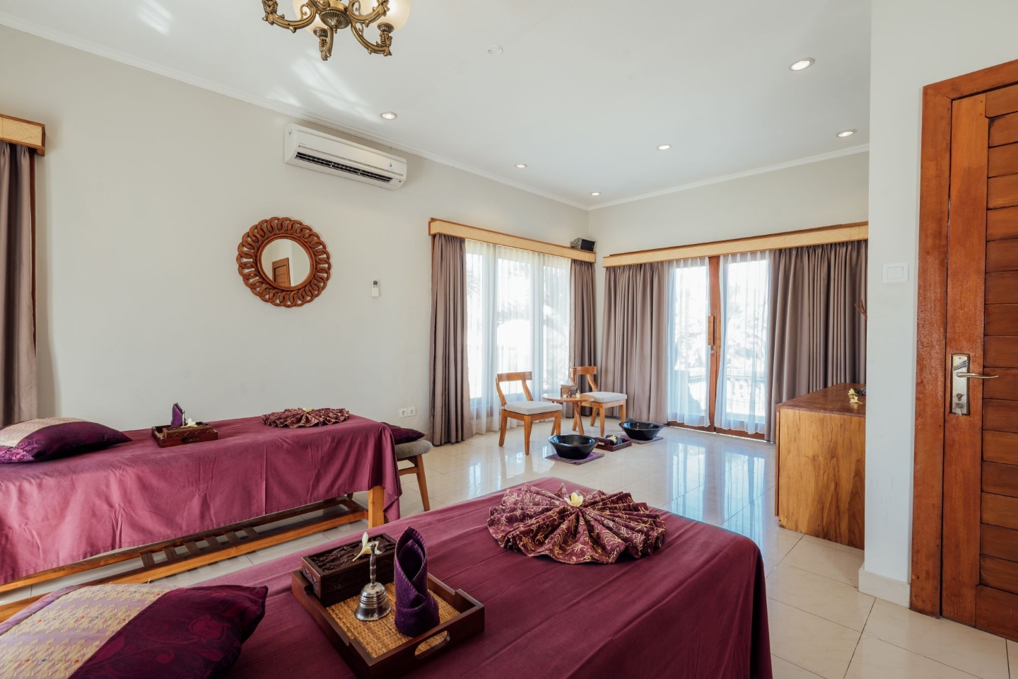 There are a total of 94 rooms, spread across 24 villas and 7 deluxe rooms. This four-star resort is located on the shores of Keramas Beach in Gianyar, Bali.