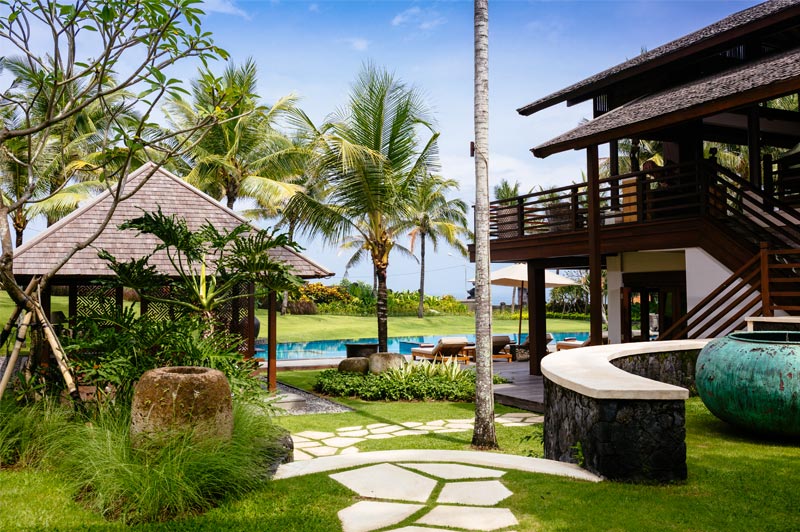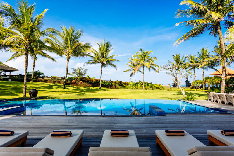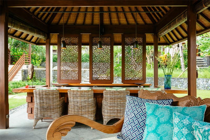 Living areas: Open-sided living room; poolside bar and lounge; media room with pool table; dining pavilion with table for 10; kitchen with breakfast bar; poolside dining deck with table for 10; sunset balé. Bedroom: 10 adults (5 bedrooms: 4 with king-size beds; 1 with twins convertible to a king). 5 extra beds can be set up on guest request at additional charge. Entertainment: 60-inch TV with surround-sound and multiple-zone central music system in media room; 26/40-inch satellite channel TVs in bedrooms; DVD players; Bose iPod docks. For Family: baby cot; high chair; car seat; shallow section in the pool. Sports: swimming pool, Pool table; table tennis; tennis court (shared), volleyball, 2 bicycles.; and unlimited WiFi and the flawless service of its team of staff.