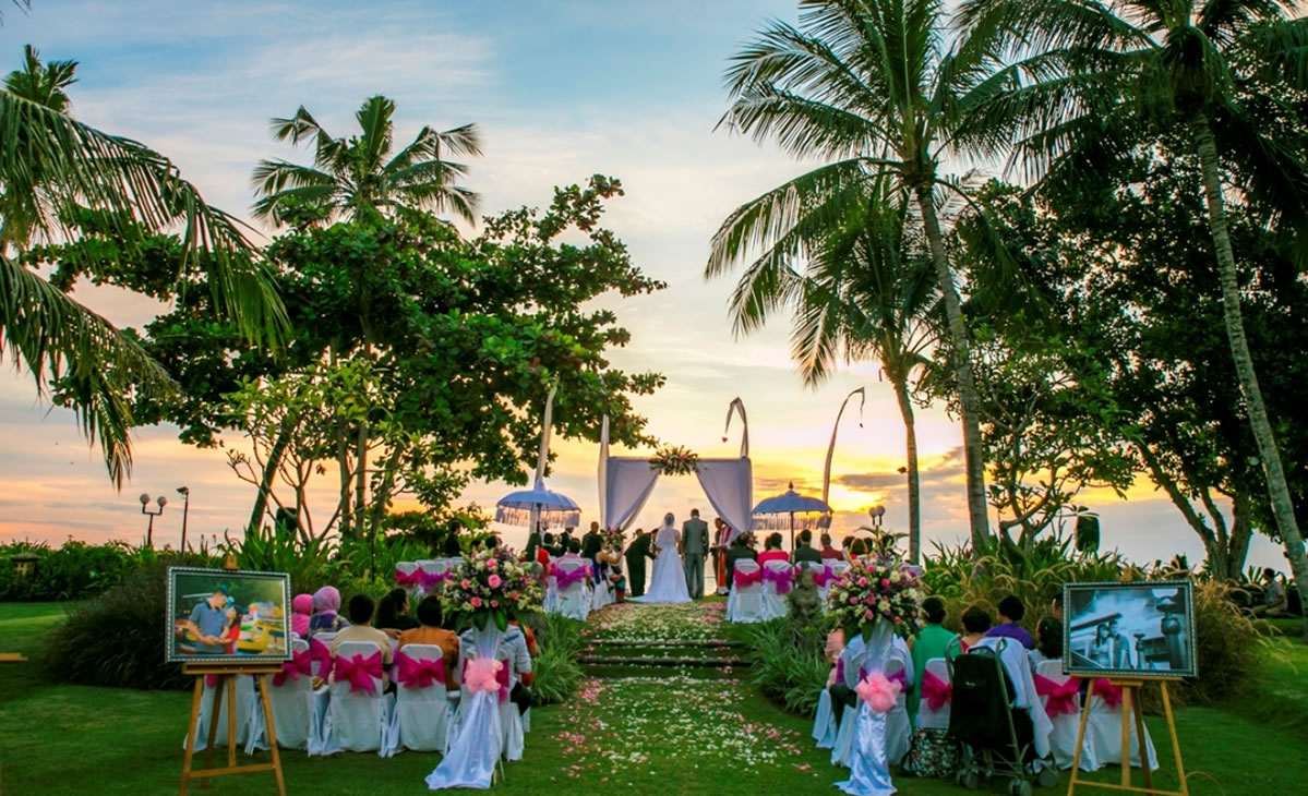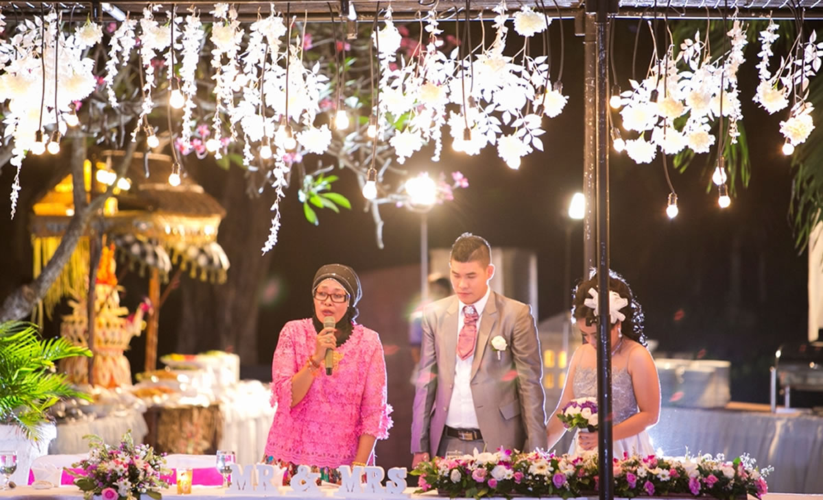 Patrajasa located in south kuta next to Ngurah Rai International Airport.Patrajasa offer spacious garden for wedding function or any function .Stunning sea view and sunset can be viewed from the Garden during good weather .Arif and Amel choose this place for their marriage solemniaztion on 1st june 2016 ,the ceremony was Christian,attended by around 80 guest .The dinner reception held around the pool .this dinner area is provided with a permanent stage.The stage size around 4x 6 m with Balinese gate and oranament .The couple love Indonesian food caterred by Patrajasa.
