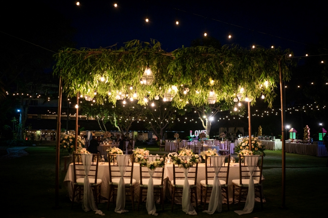 - Dinner decor includes fairy light/light bulb, banana trunk with candle, bridal table decor, guest flower centerpieces, registration table, angpao box, and welcome board