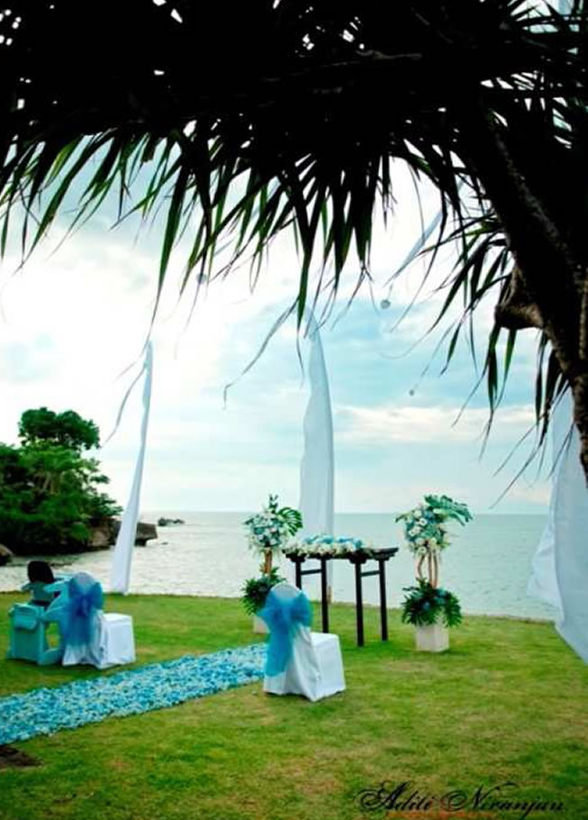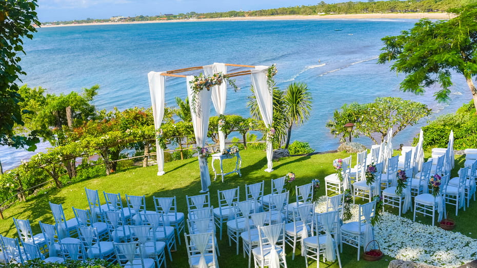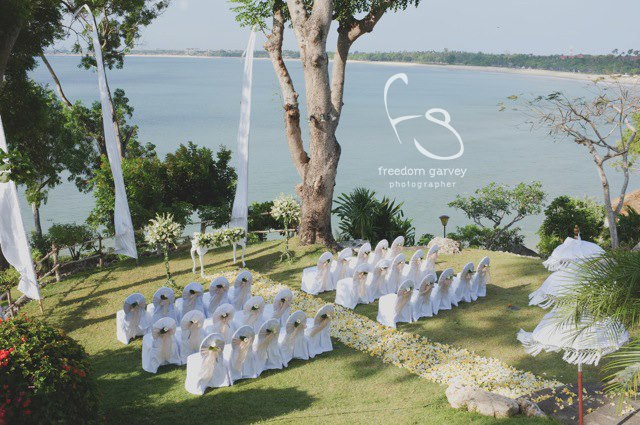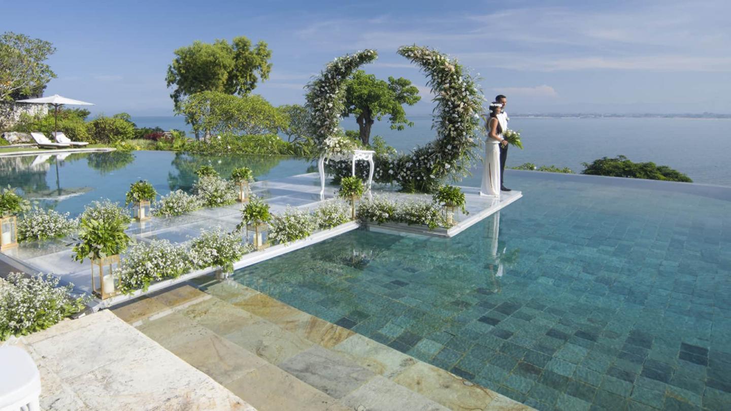 Four Season Jimbaran offers you a spectacular wedding venue at the Pool Terrace. The venue offers 180-degree ocean views from 35 metres above the sea. We have created an Intimate Water wedding package for 30 persons include stay accommodation, wedding decoration, dinner reception, entertainment, and wedding organizer from Bali Shuka