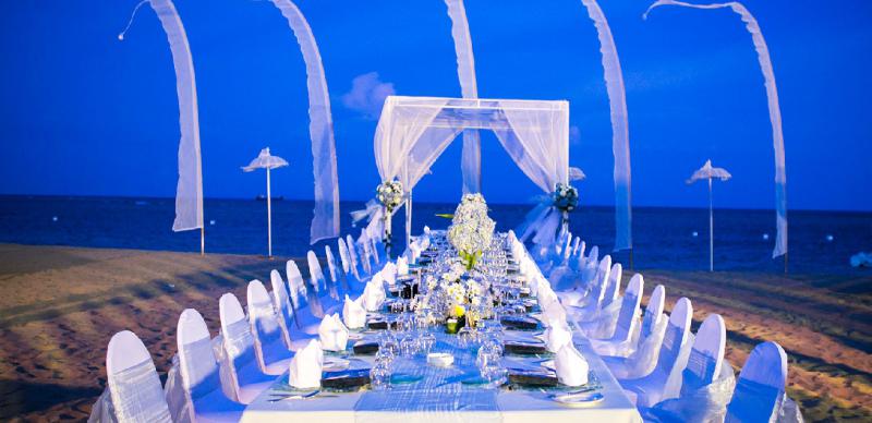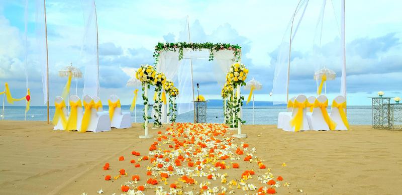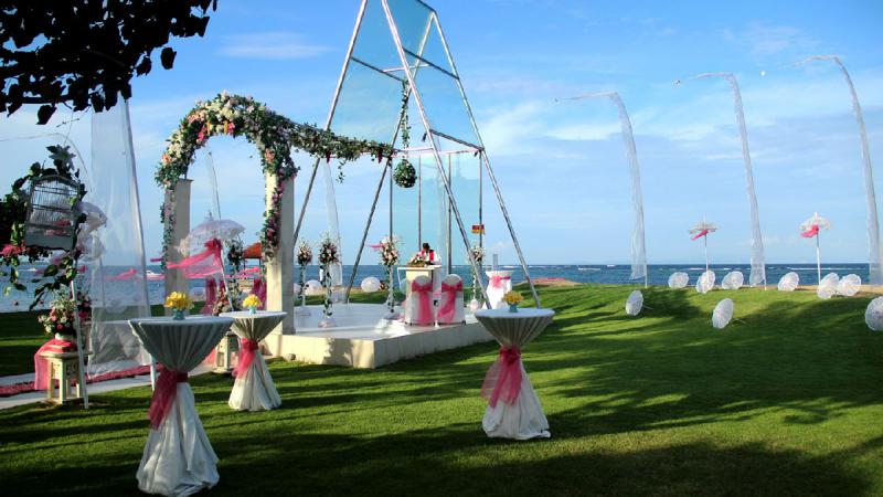 Sandat Grand Mirage wedding package is designed for 50 persons. This wedding package already includes one time usage of beach or garden venue at Grand Mirage Resort, two night stay for bridegroom, dinner reception, entertainment, photo & video service, wedding decoration and also wedding planner and coordinator services from Bali Shuka.