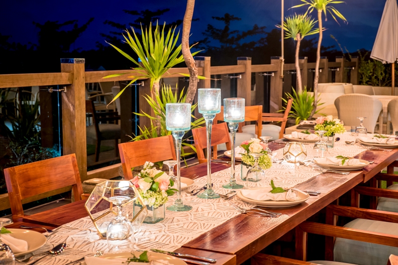 • Dinner decoration includes photobooth, fairy light/light bulb, simple table set up for 6 pax with centerpieces and candles, banana trunk with candle, 4-guest centerpieces, welcome board, registration desk, angpao box, guestbook.