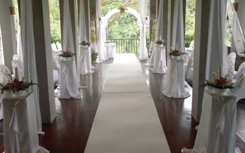 • Ceremony decoration includes arch flower, flower shower petals, altar table & flower centerpiece, standing flowers, and aisle flower arrangements