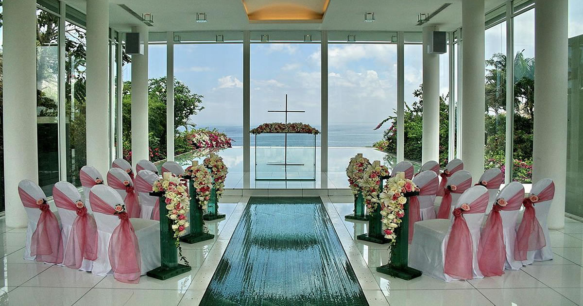 Bali Wedding Astina chapel? IT is located within the Ayana resort Jimbaran . The chapel specially designed with glass wall.Perched near the cliff top over looking to Indian ocean . Astina air-conditioned wedding pavilion can accommodate about 80 person for ceremony .The wedding pavillion surrounded by water pond. Beautiful landscape for photo session after wedding ceremony