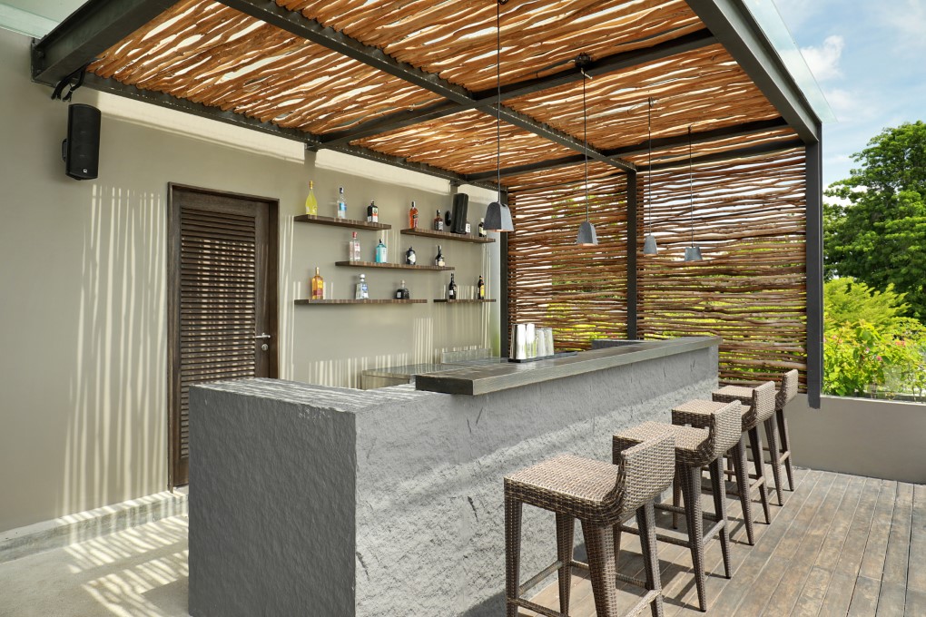 The private pool villas offer an outdoor patio with a dining area, separate bathtub and rain shower, and a bed with a King Koil mattress and fine linens.