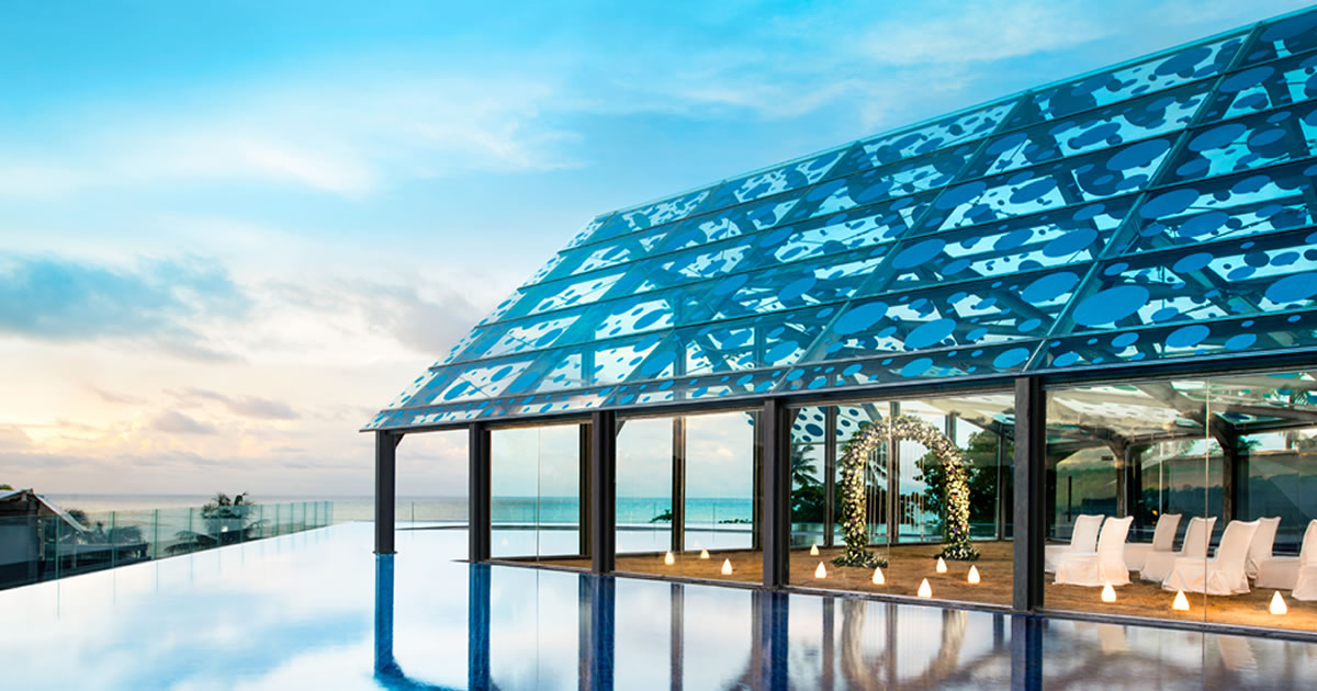 Experience the perfect Bali wedding at Le Meridien Jimbaran, featuring a stunning rooftop chapel wedding pavilion with panoramic views of Jimbaran Bay. This exquisite Bali wedding venue offers various accommodation options for couples and guests, ensuring a comfortable stay. The elegant Bali chapel accommodates up to 50 guests for an intimate ceremony. Adjacent to the chapel is a fully air-conditioned hall ideal for indoor wedding receptions, along with a lush grassy area perfect for cocktail gatherings and breathtaking photo sessions.