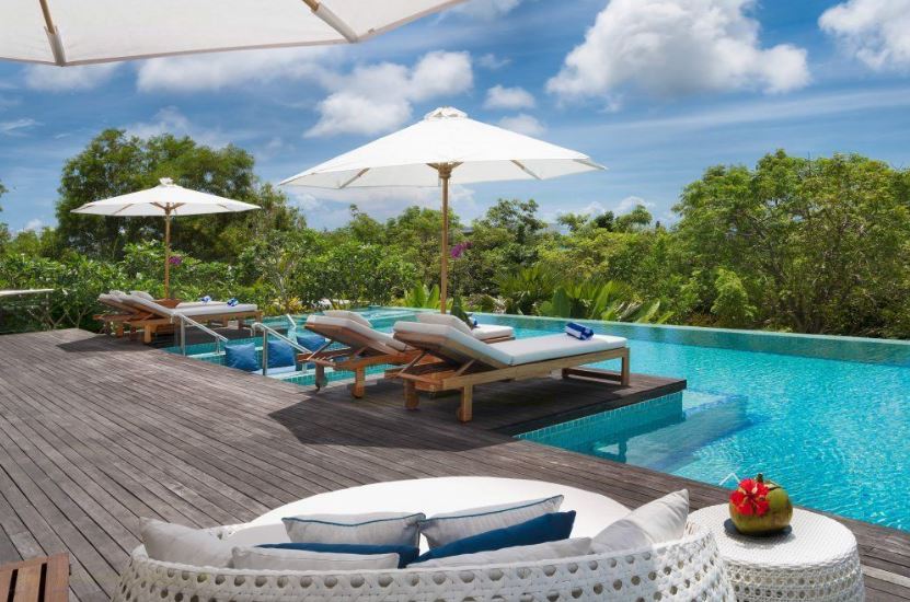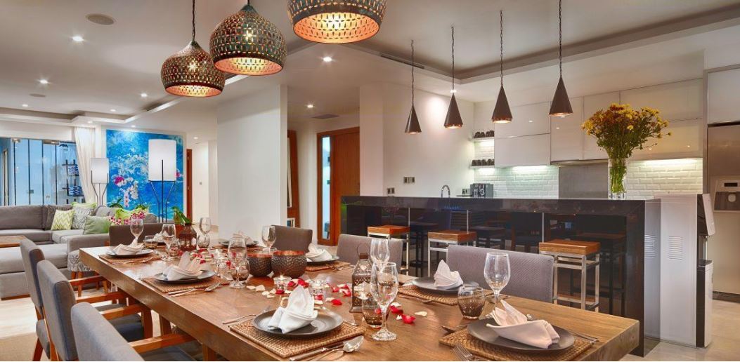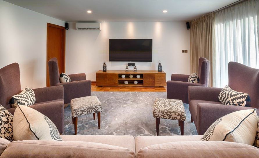 Living areas: Air-conditioned indoor living & dining area with Satellite TV channles, Rooftop terrace entertainment area, Air-conditioned Media Entertainment room with widescreen TV and large sofa, poolside terrace lounge areas, fashionable sunken seating area inside the pool. Bedroom: 4 air-conditioned double bedrooms, 3 with king size beds & 1 with twin beds, all with ensuite bathrooms, fitted with a teakwood floor and equipped with wardrobes and safety deposit box and balcony deck. There is an additional twin bedroom for 2 children and adjoining nanny room with a shared bathroom. Entertainment: Air-conditioned TV entertainment room with Satellite TV with international channels, DVD Player & DVD library, IPod speakers, Large TV in the main living room area, Miniture golf course on premises with golf equipment, Wifi Internet. Sports: 1 private 16 meter long x 7 meter wide x 1.5 meters deep, infinity style pool with stunning views, bordered by a wide timber deck furnished with sun loungers, pool incorporates a jacuzzi and a fashionable sunken seating area for relaxation, fully equipped air-condtioned Gym Room, a Steam Room & Spa Massage Room.;;Fully Equipped Kitchen, and the flawless service of its team of staff.