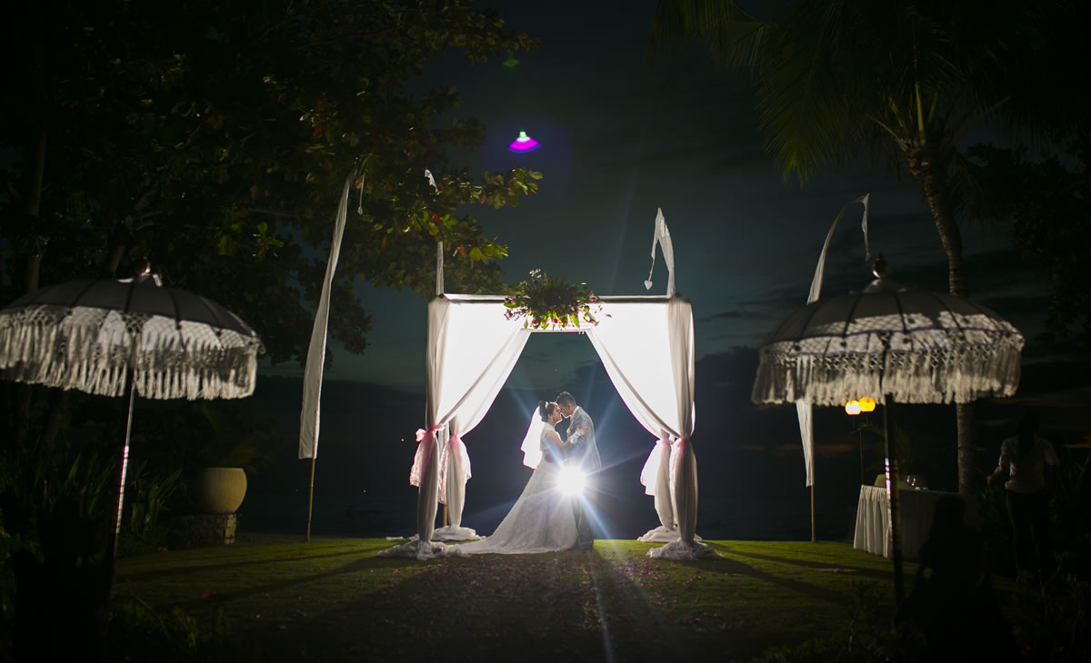 Patrajasa located in south kuta next to Ngurah Rai International Airport.Patrajasa offer spacious garden for wedding function or any function .Stunning sea view and sunset can be viewed from the Garden during good weather .Arif and Amel choose this place for their marriage solemniaztion on 1st june 2016 ,the ceremony was Christian,attended by around 80 guest .The dinner reception held around the pool .this dinner area is provided with a permanent stage.The stage size around 4x 6 m with Balinese gate and oranament .The couple love Indonesian food caterred by Patrajasa.