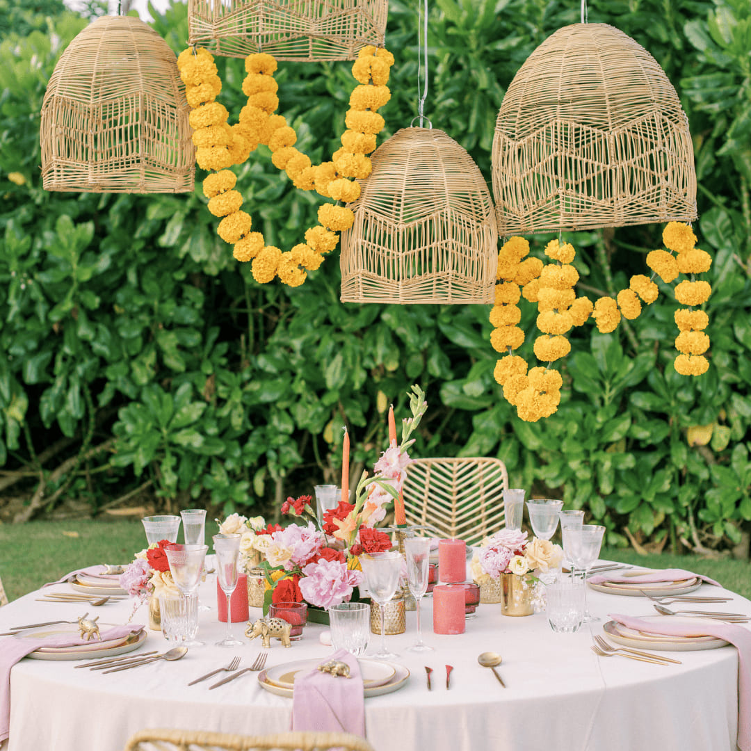 - Dinner decoration includes fairy light/light bulb, bridal table set up for 6 pax with centerpieces and candles, banana trunk with candle, guest centerpieces, registration desk, angpao box, guest book.