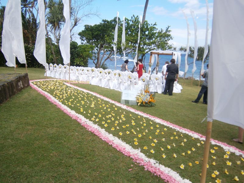 - decoration, traditional Balinese ‘Umbul–Umbul’ flags, an aisle of flower petals leading to the altar