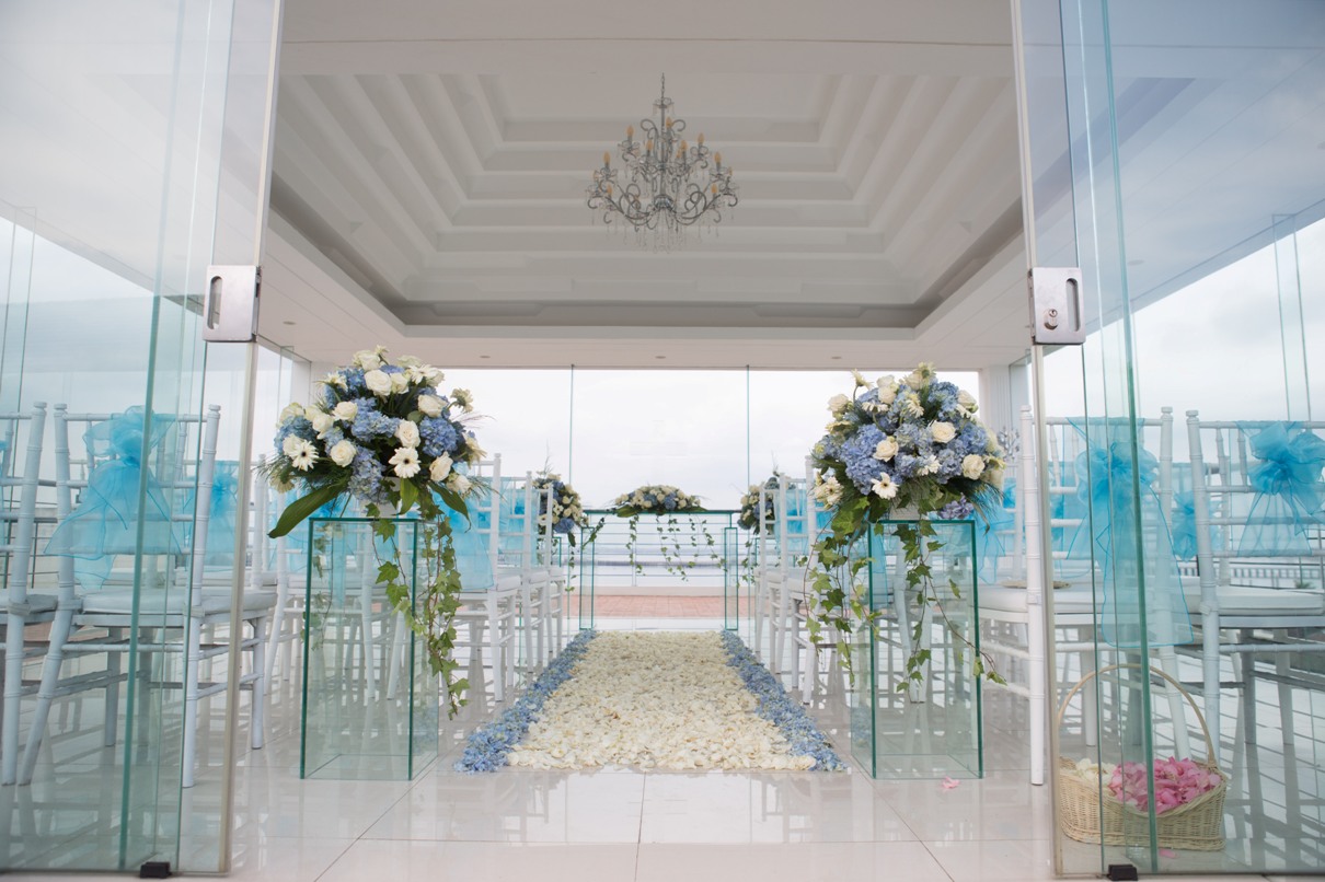 - Ceremony decoration: arch/elbow flower, altar table & flower centerpiece, standing flower, flower aisle arrangement, flower confetti, welcome board