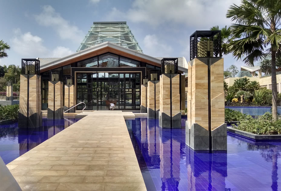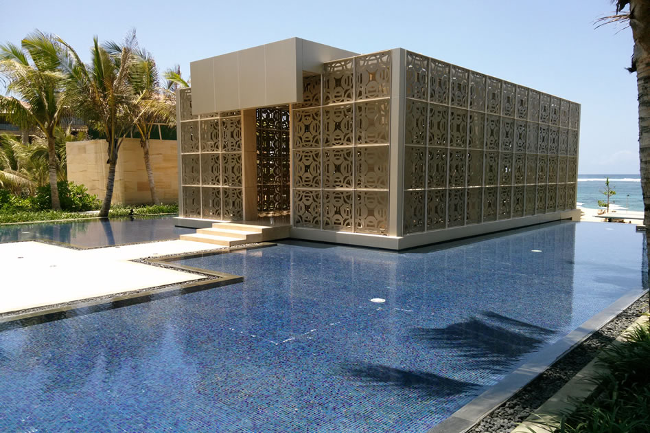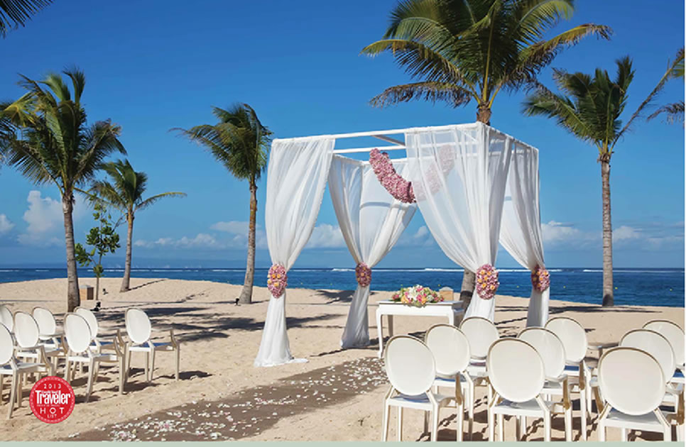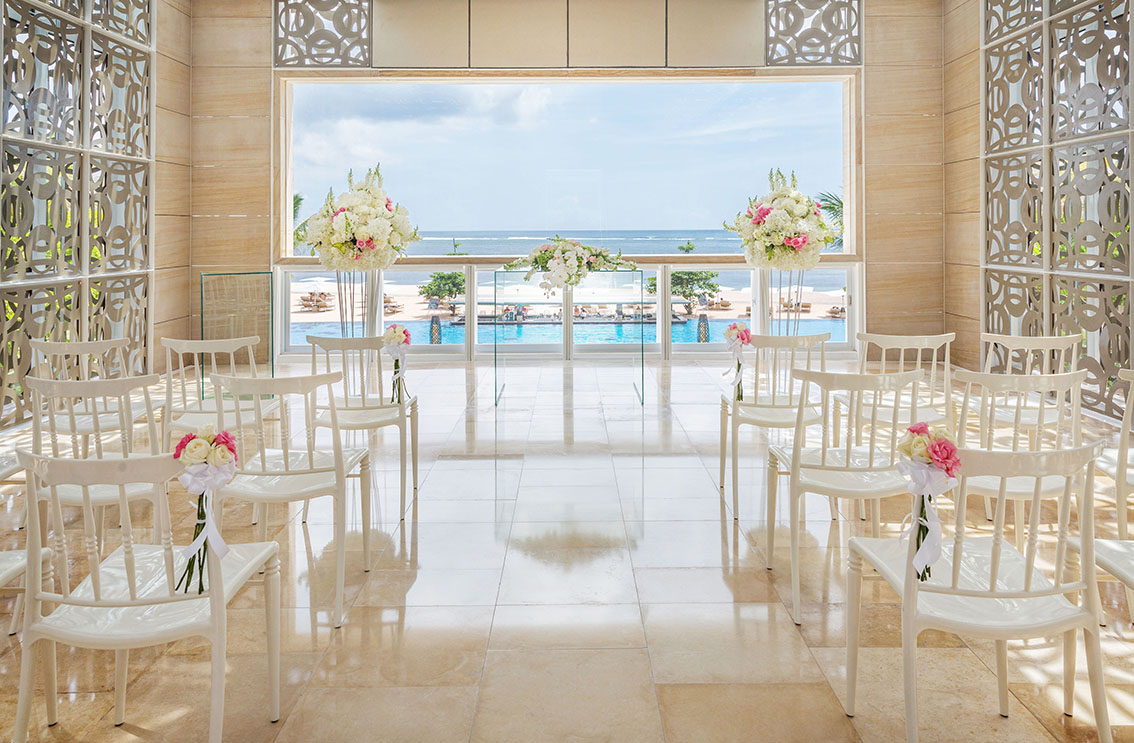 What is inclusion of Jade wedding package at Mulia Bali Resort? Wedding ceremony venue set up at a fully air-conditioned wedding chapel and ocean facing chapel by the beach followed by reception at Table 8 for 90 guest in reasonable price.