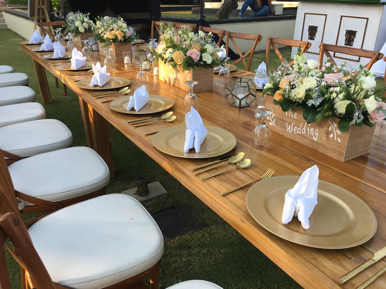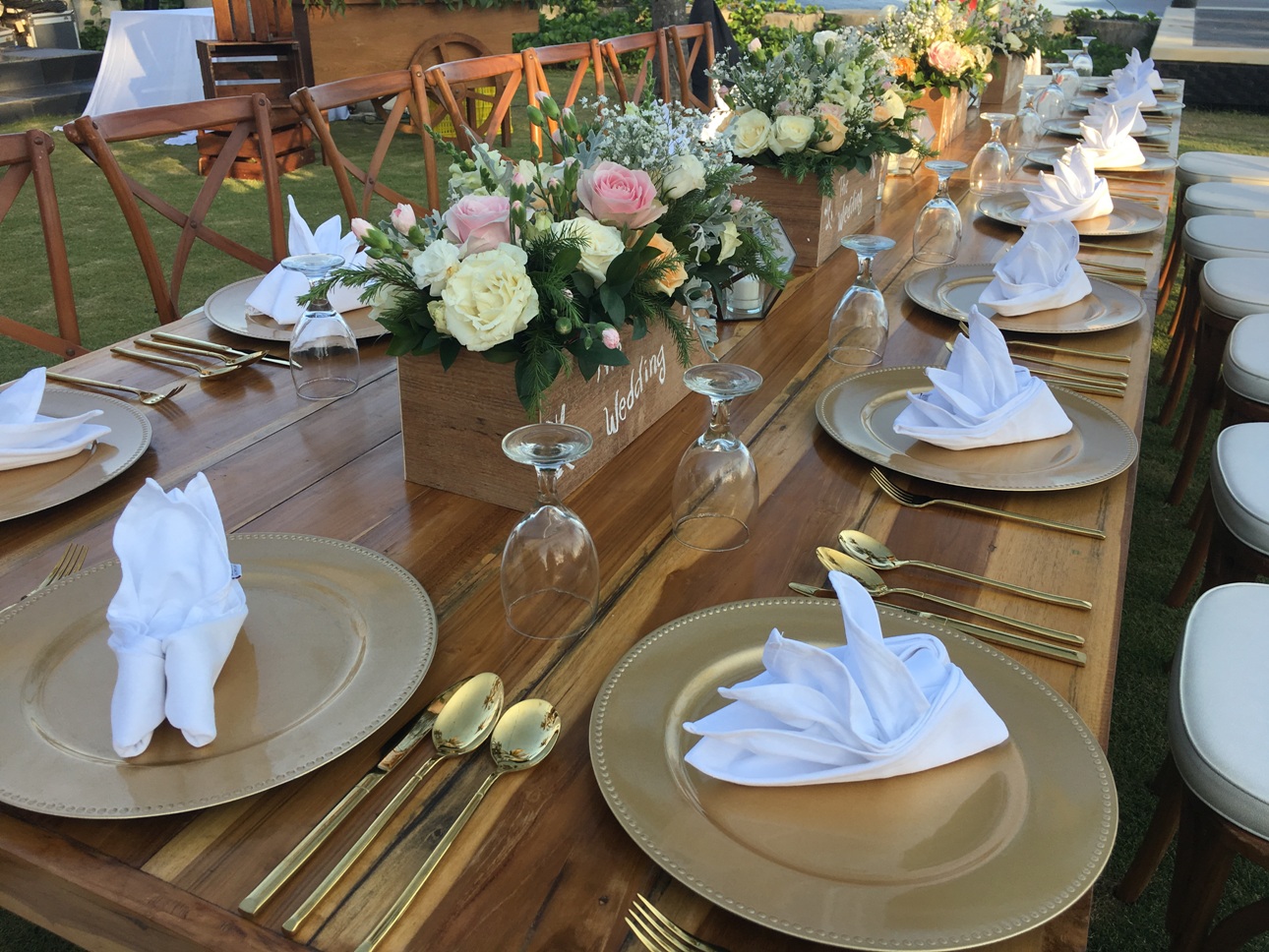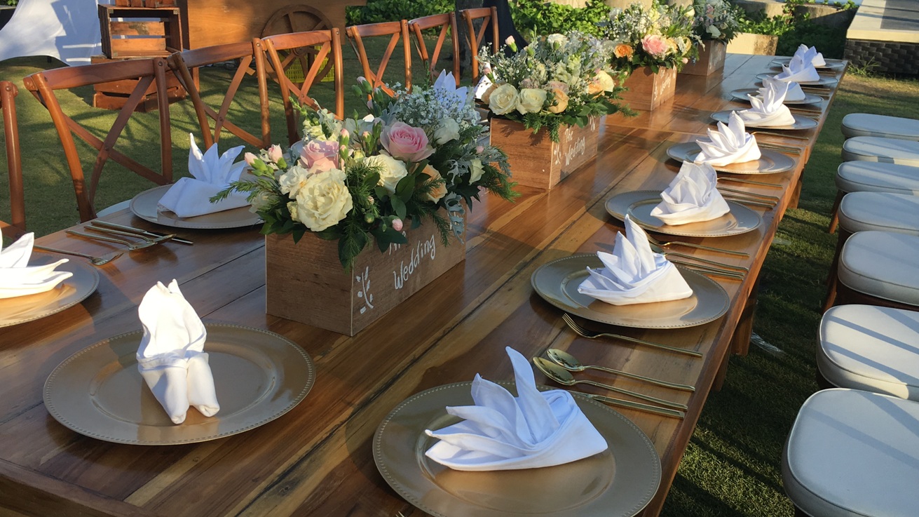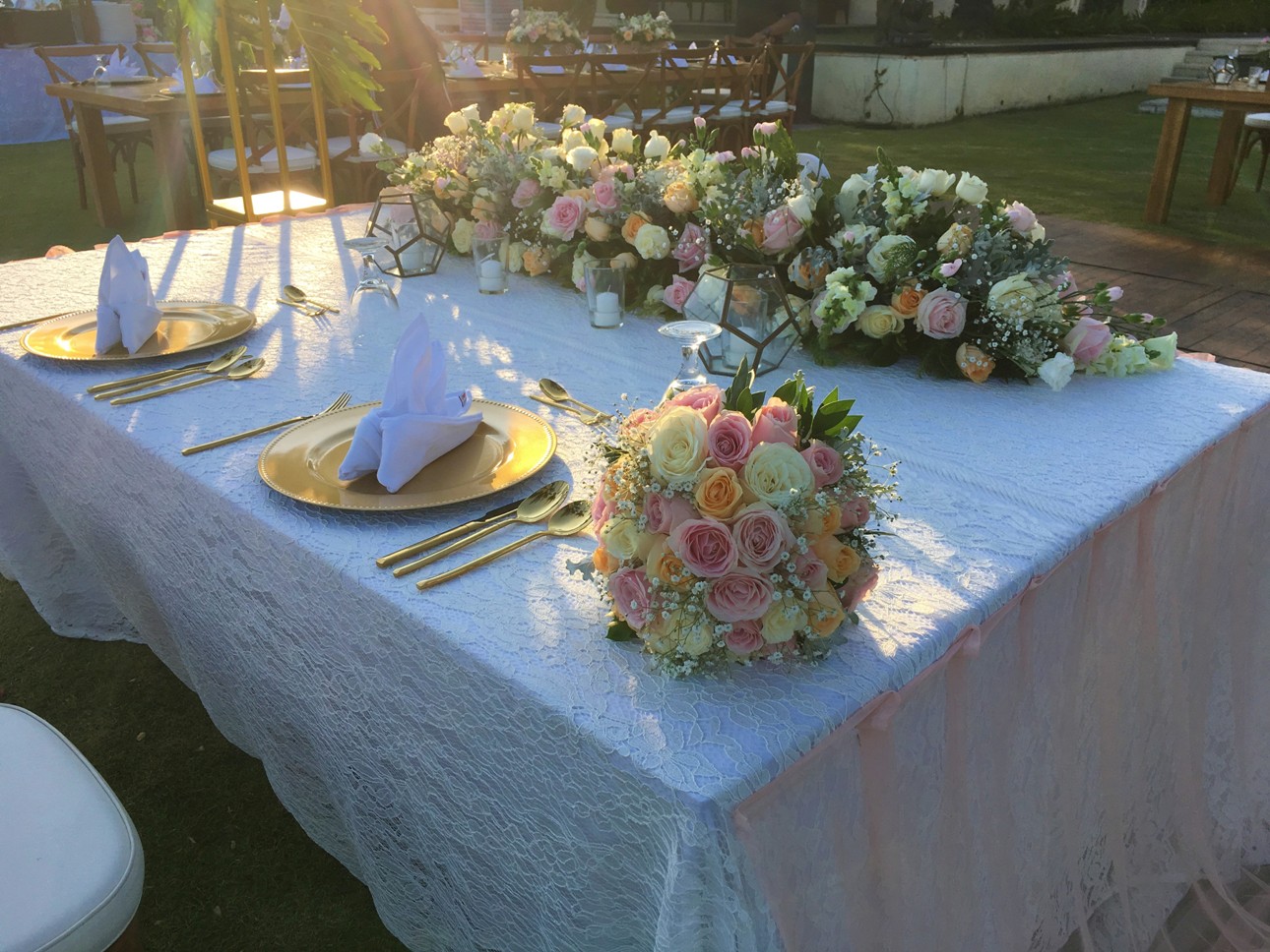 • Dinner decoration includes fairy light/light bulb, bridal table set up with centerpieces and candles, banana trunk with candle, guest centerpieces, registration desk, angpao box, guestbook.